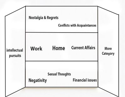 I personally visualize my mind as a convex panel divided into three sections: